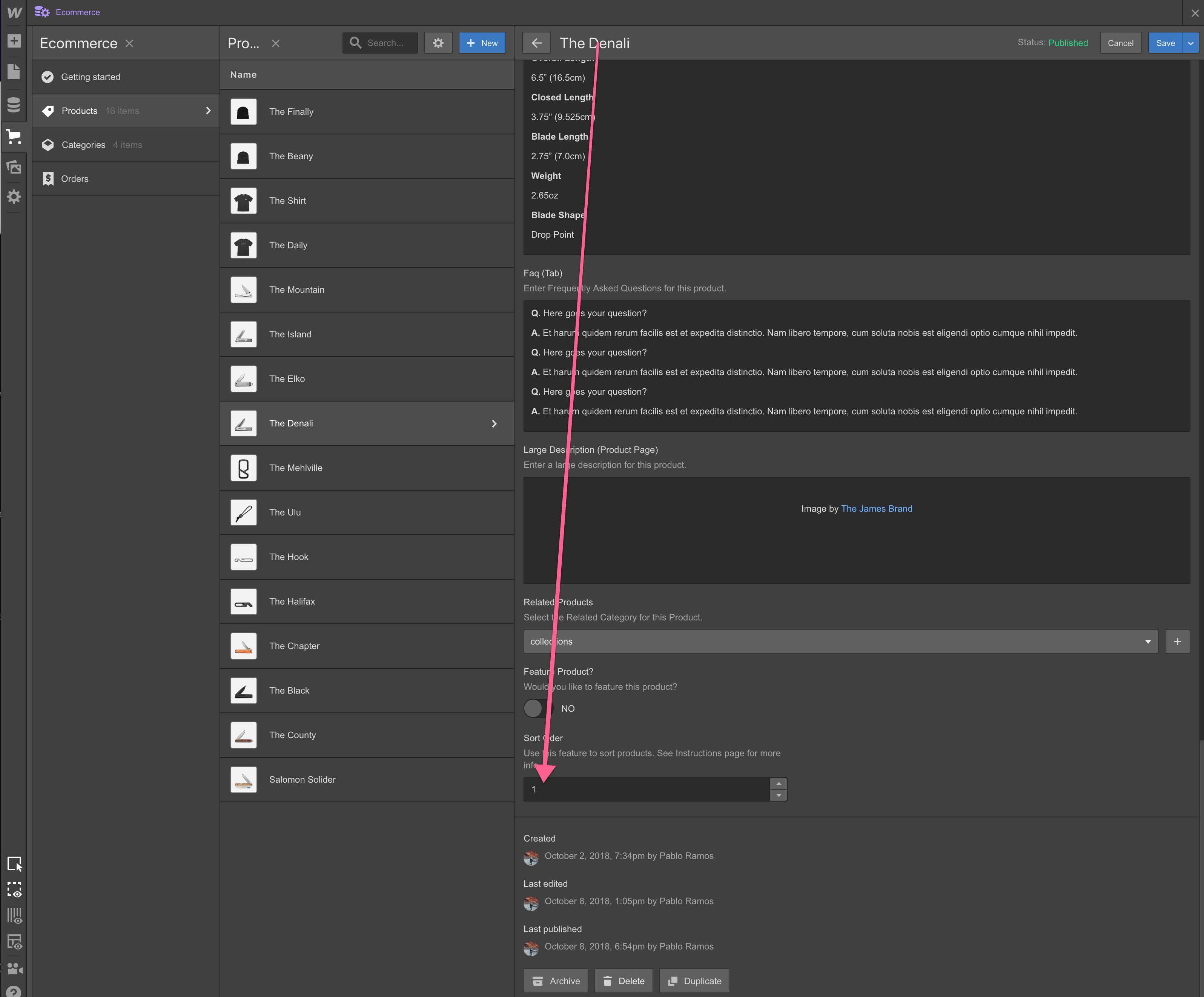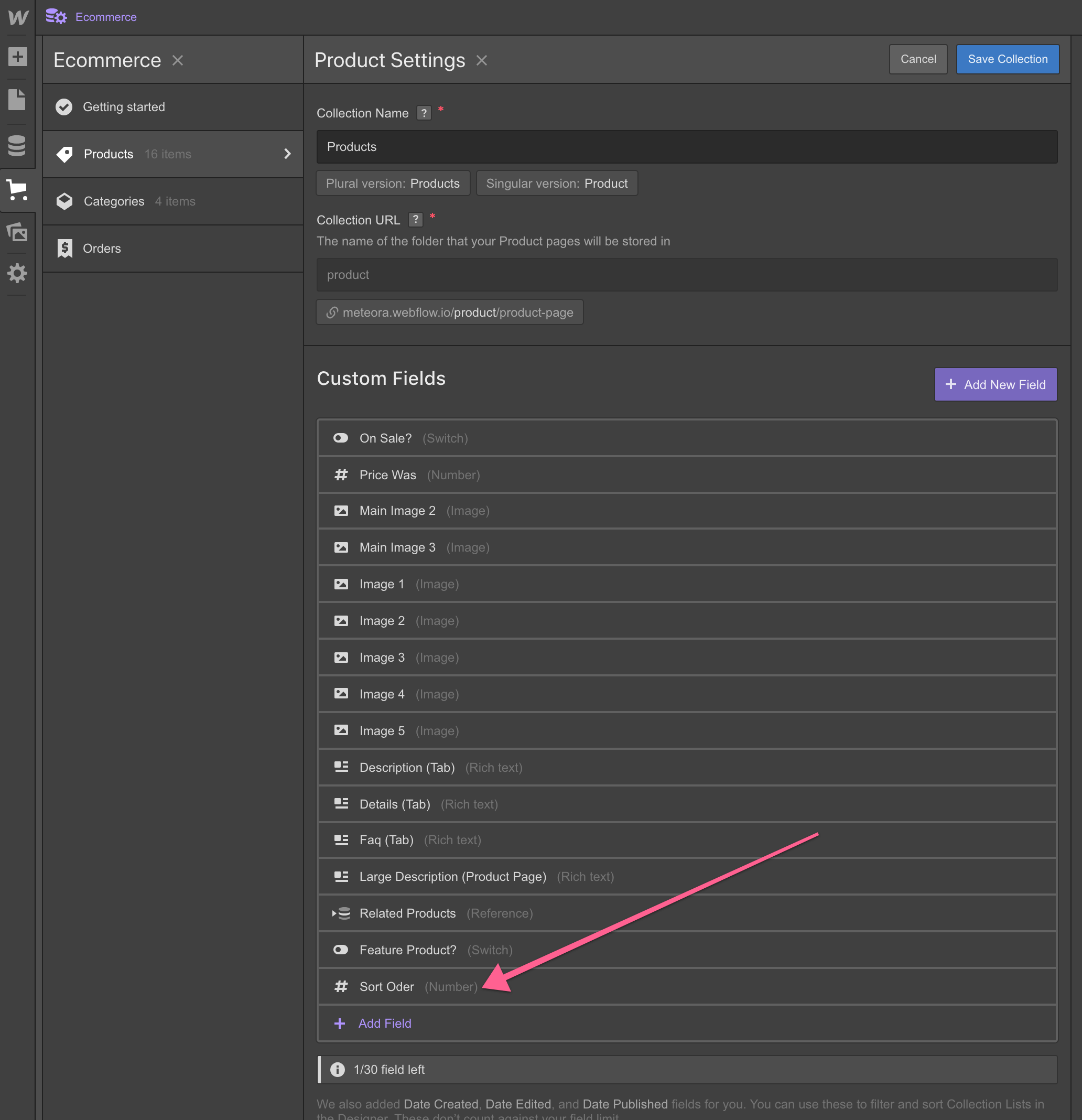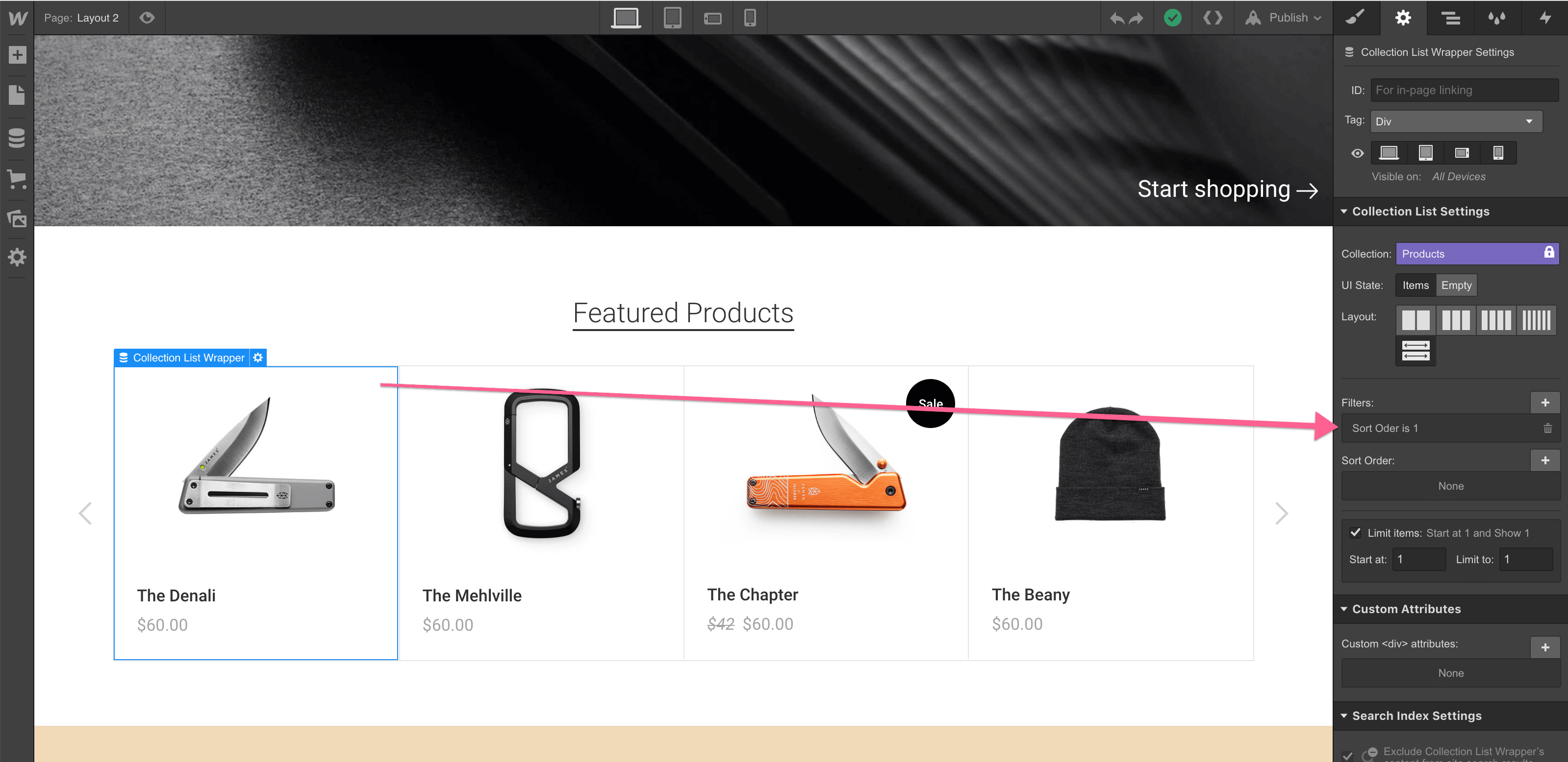 2. Next, on the filter settings of your Collection lists, select the Sort order number for your product. In this case the number one. Do the same for the rest of collections.